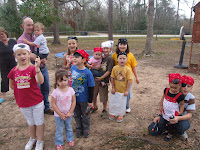 Yesterday we celebrated Kameron's 5th birthday. He wanted a pirate theme so we went with it. I made the invitations for the party using a Stampin' Up stamp set. They turned out so cute. I'll have to get a picture of someones since I didn't save one for Kameron. There were 12 pirates total, including Captain Kameron! It was a huge success. They went on a treasure hunt where they got a piece to their pirate outfit at every stop. I did the best I could getting a picture of all of them after they were dressed up. They played pin the flag on the treasure and busted open a pinata. We served hot dogs and had cupcakes.